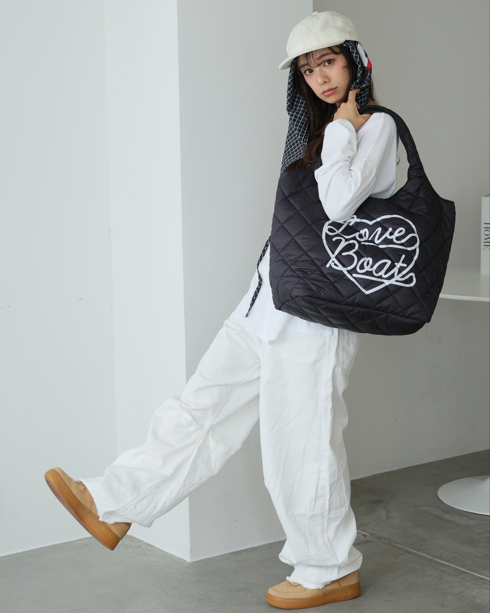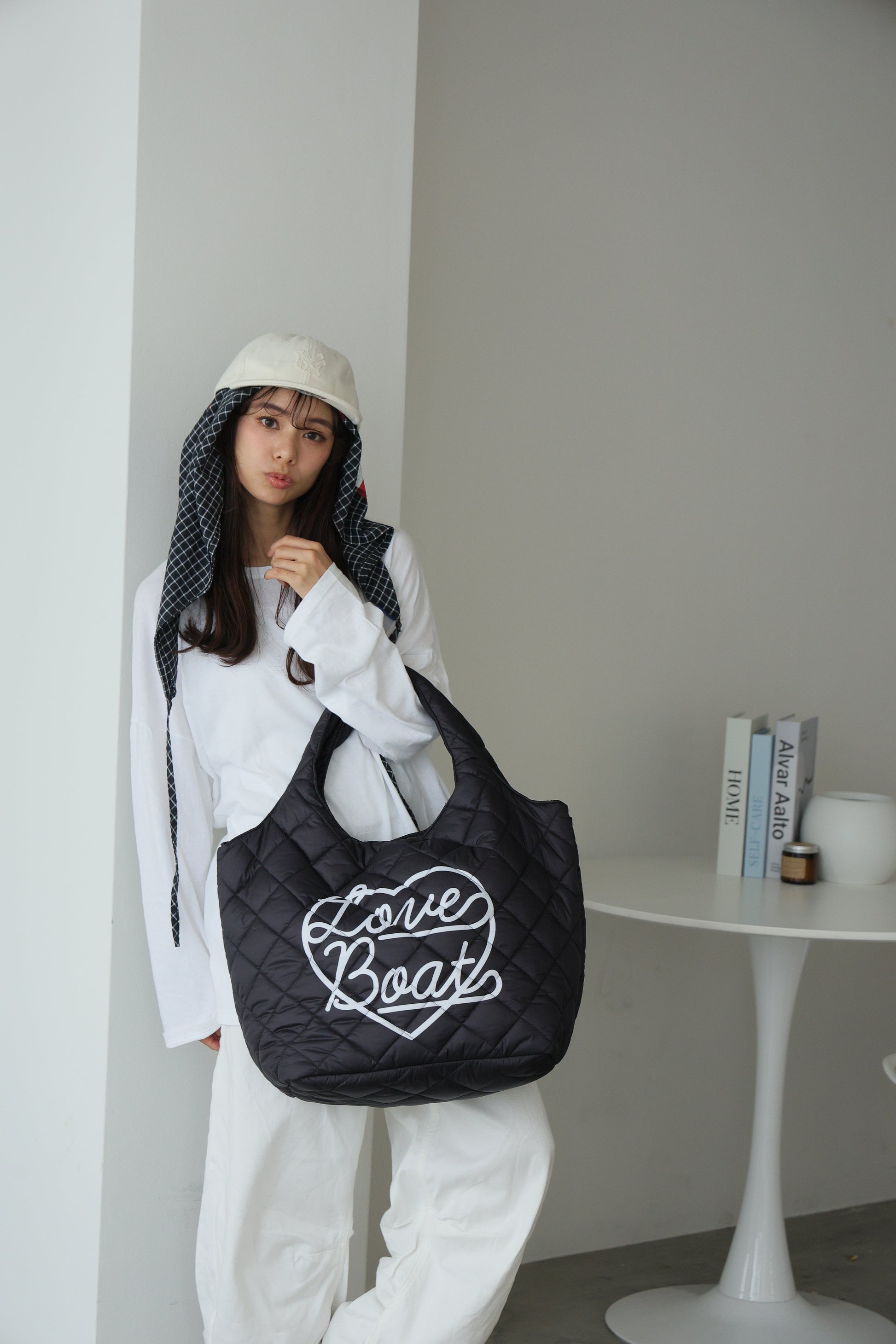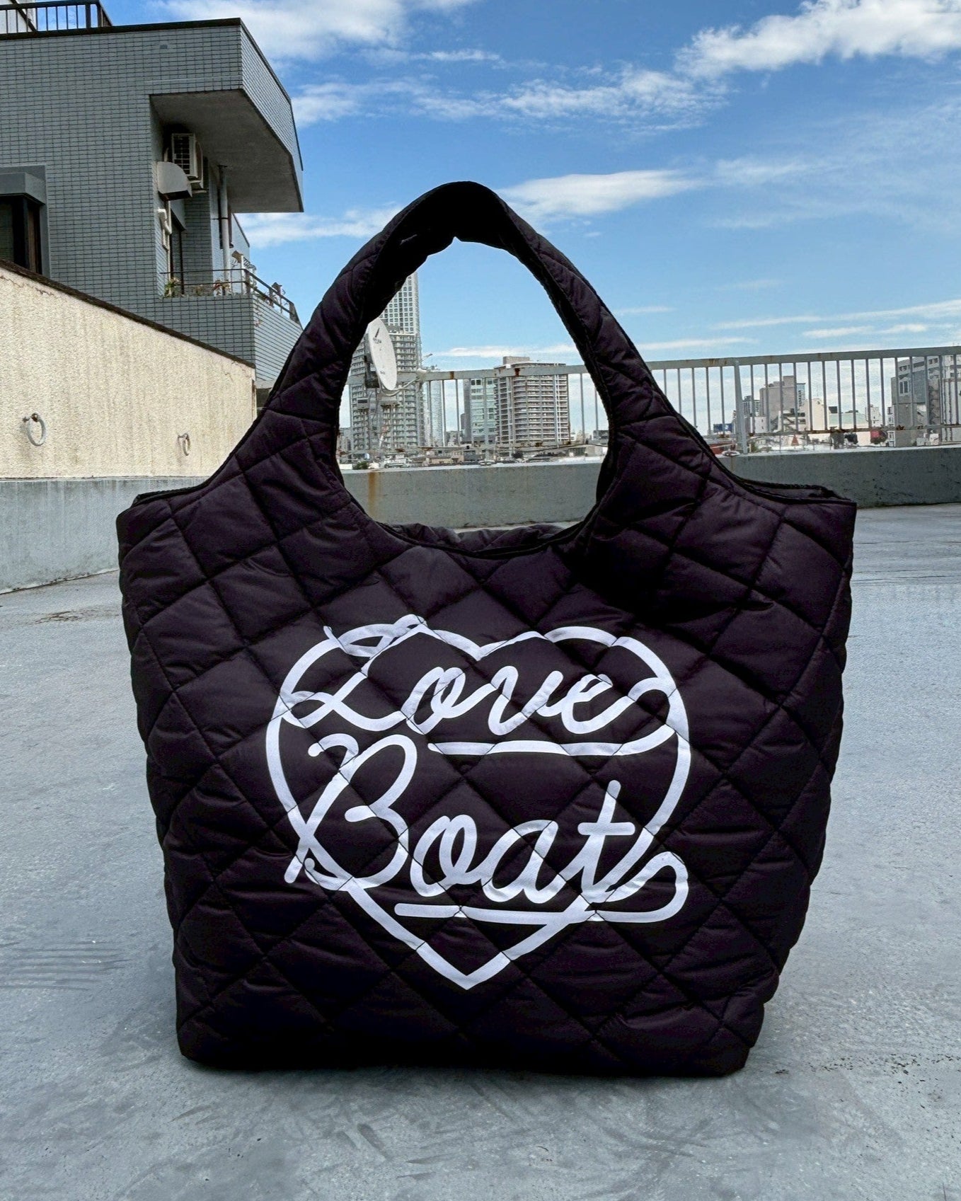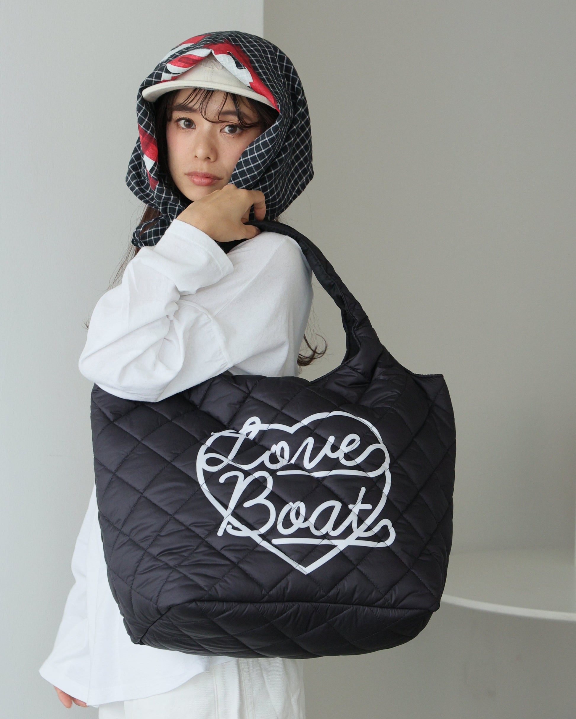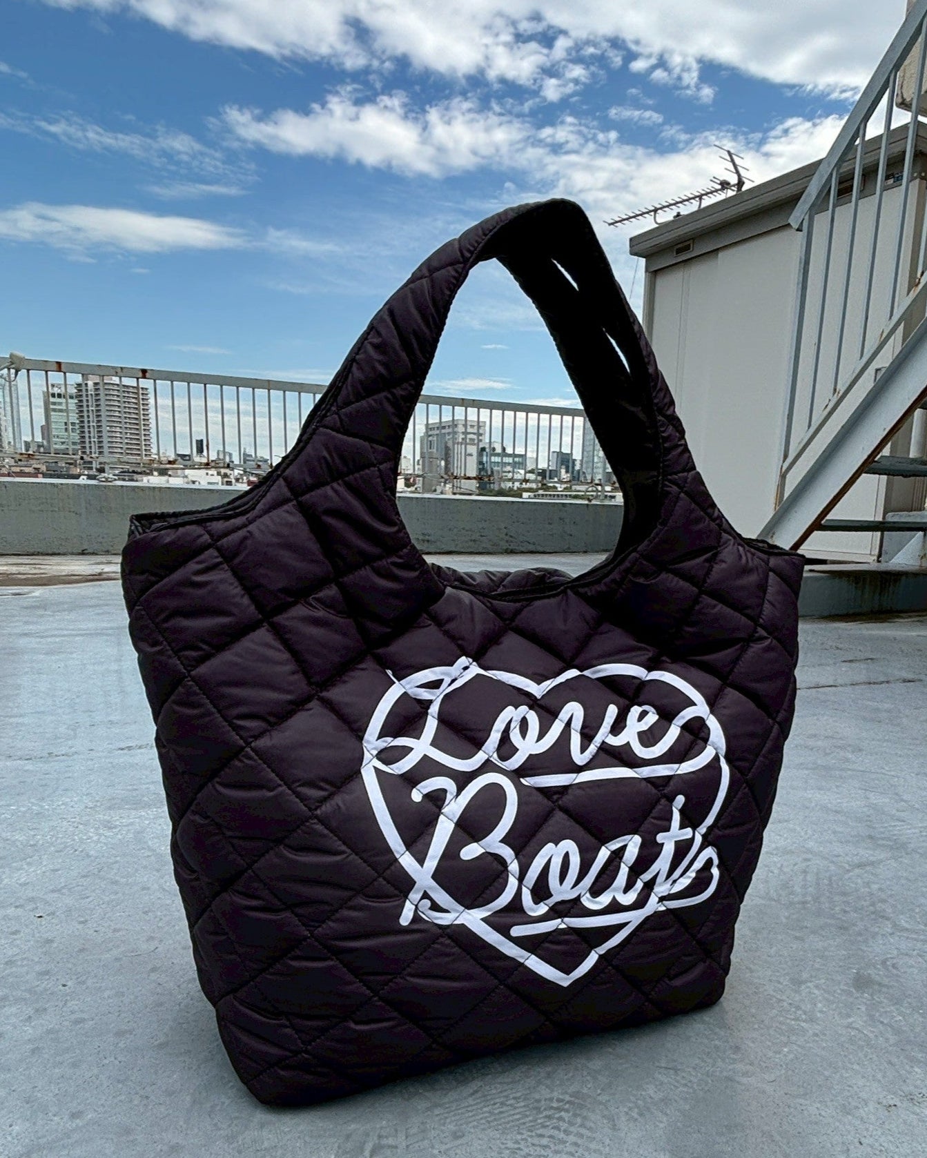 LOVEBOATのロゴを基調としたシンプルなキルティングトートバッグ。