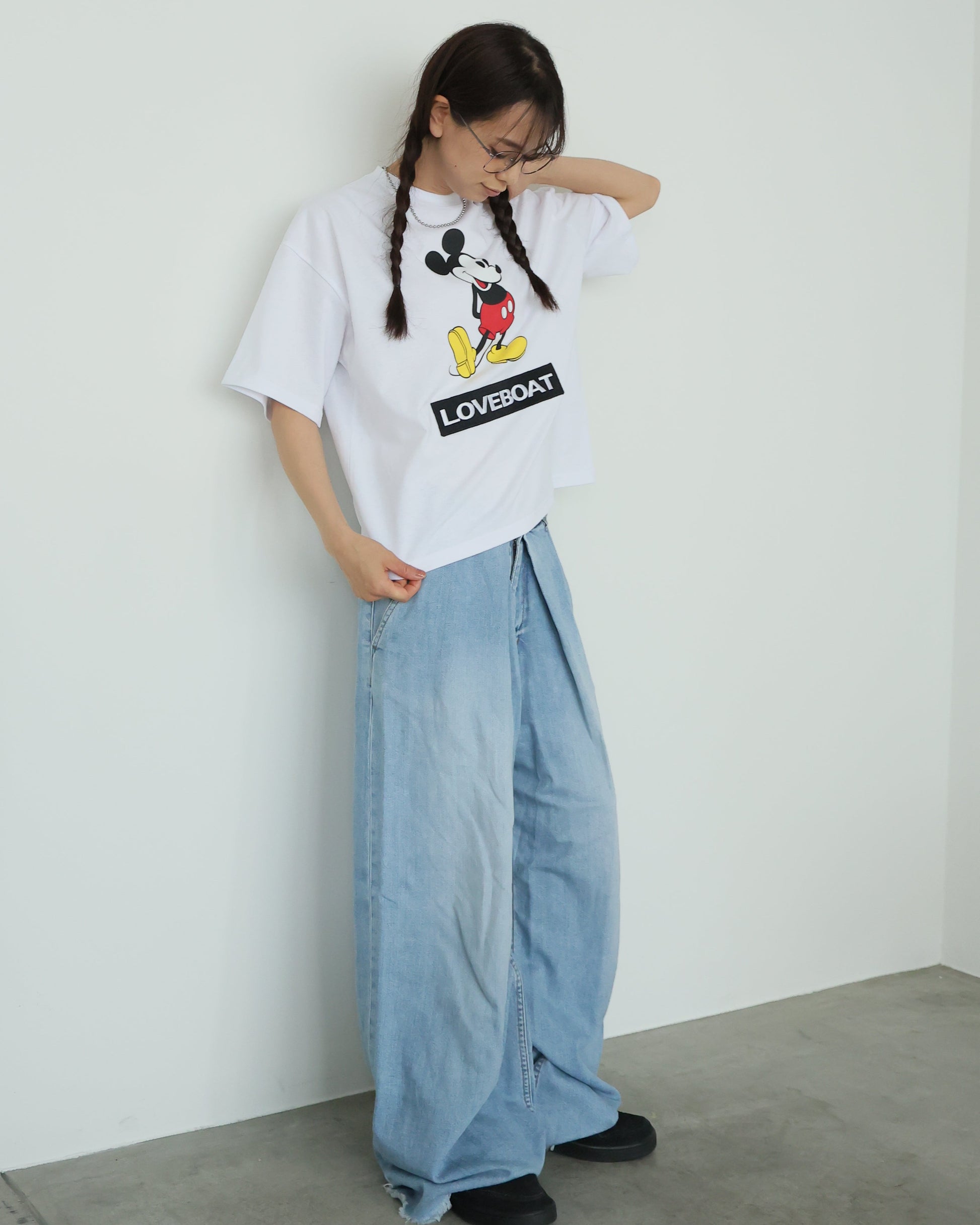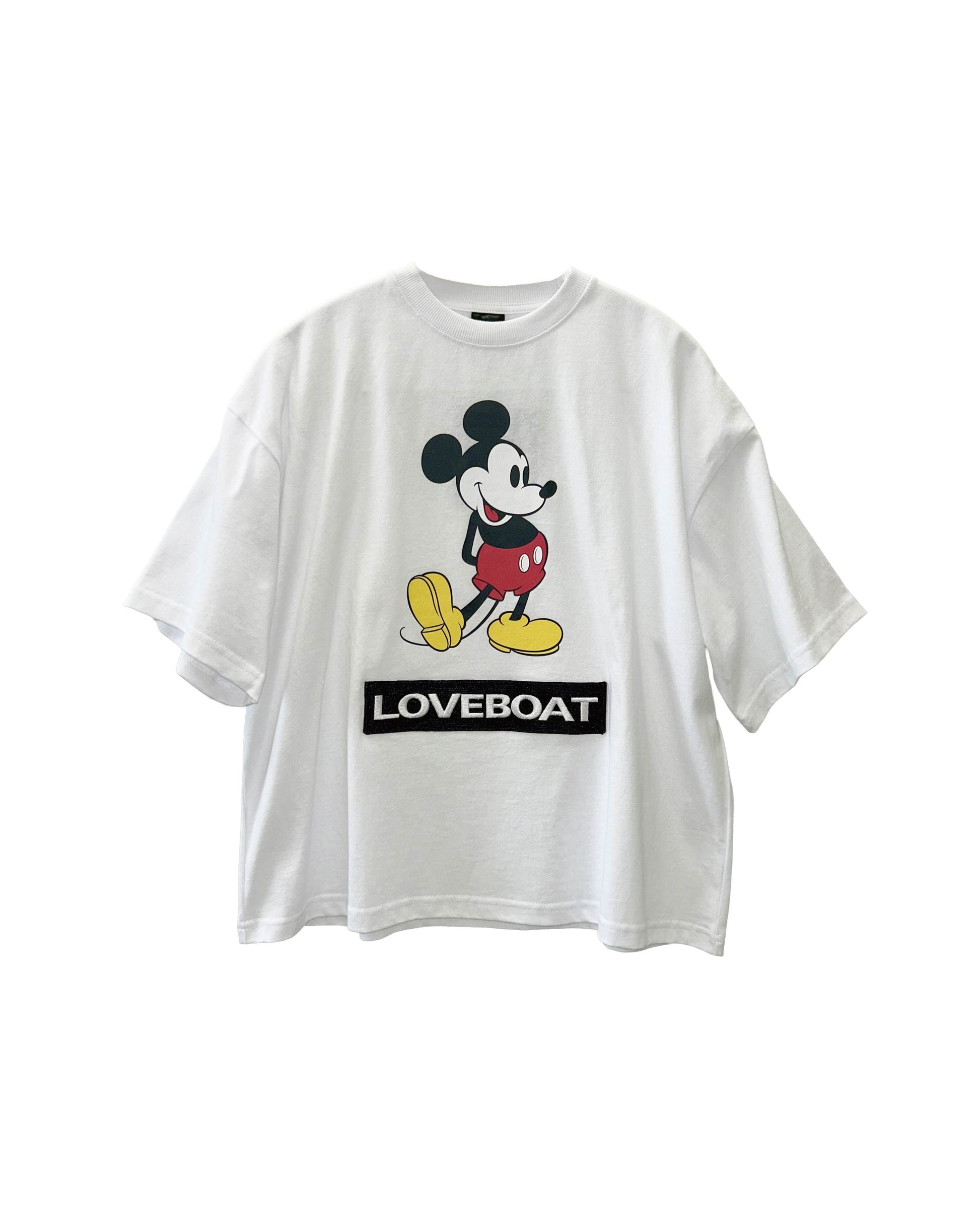 MICKEYのプリントとLOVEBOATのロゴが刺繍で施されたTシャツ。